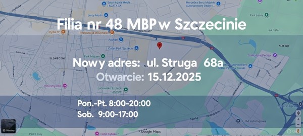 Informujemy, że od 15 grudnia 2025 roku Filia nr 48 będzie otwarta dla Czytelników w nowym miejscu: